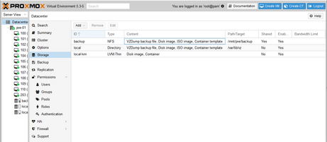 Jako magazyn danych może służyć: LVM, LVM-thin, iSCSI/kernel, iSCSI/libiscsi, Ceph/RBD, CephFS, Sheepdog, ZFS over iSCSI, ZFS (local), katalog lokalny, NFS, CIFS, GlusterFS